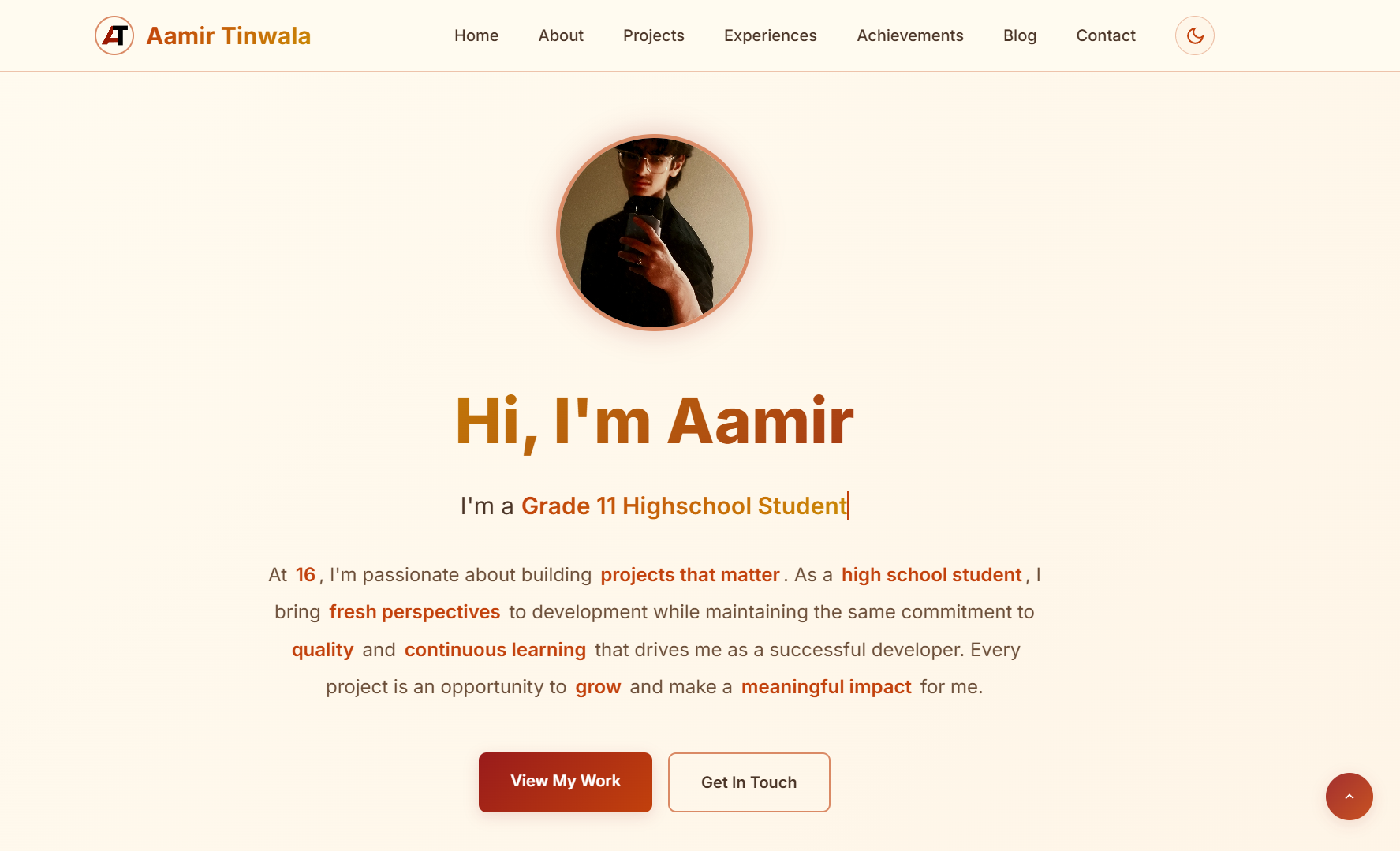 Full-Stack DeveloperThis very website! A modern, responsive portfolio showcasing my development skills and projects. Built with Next.js and custom CSS, featuring smooth animations, optimized performance, and a cozy fire theme.